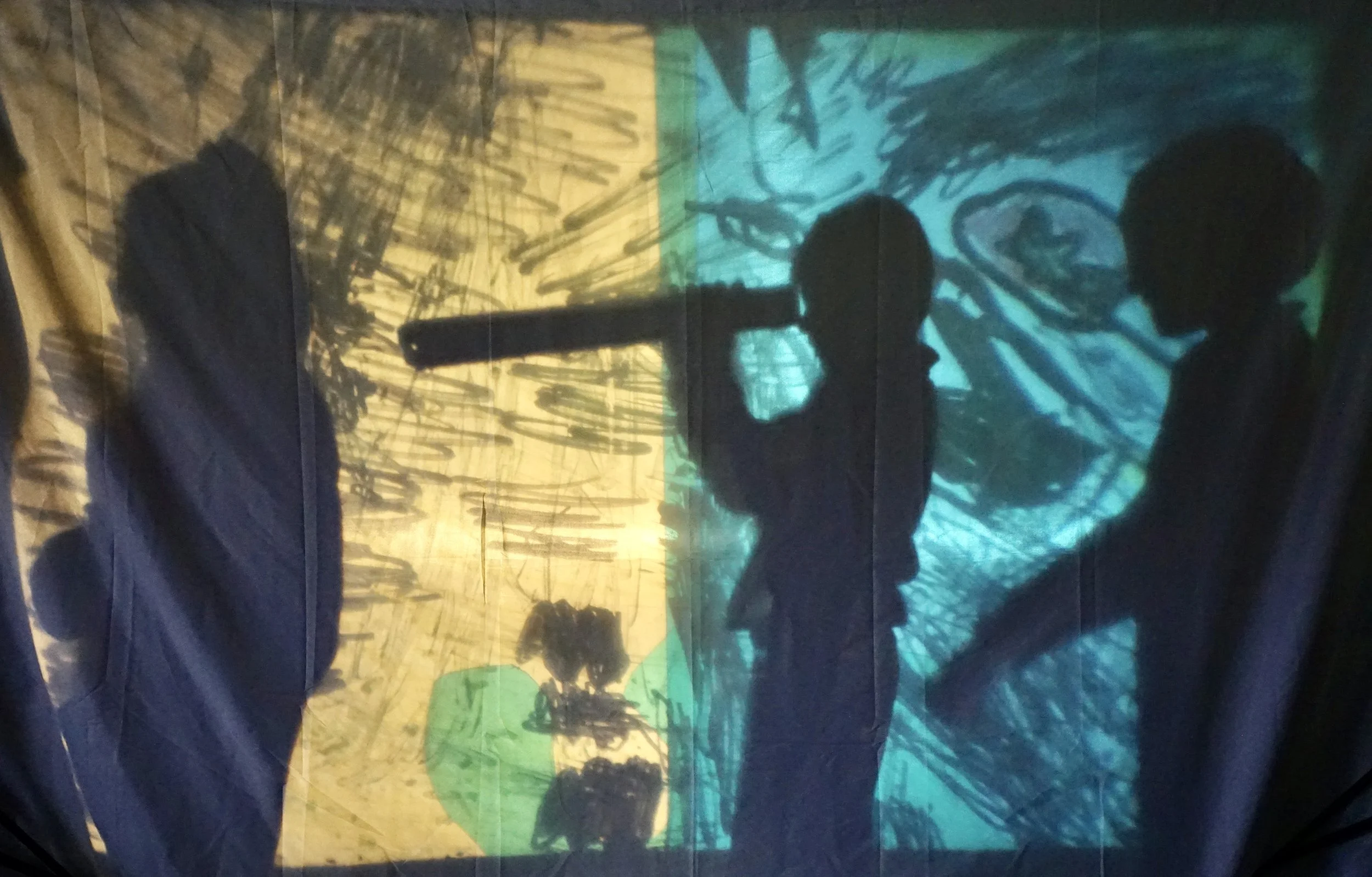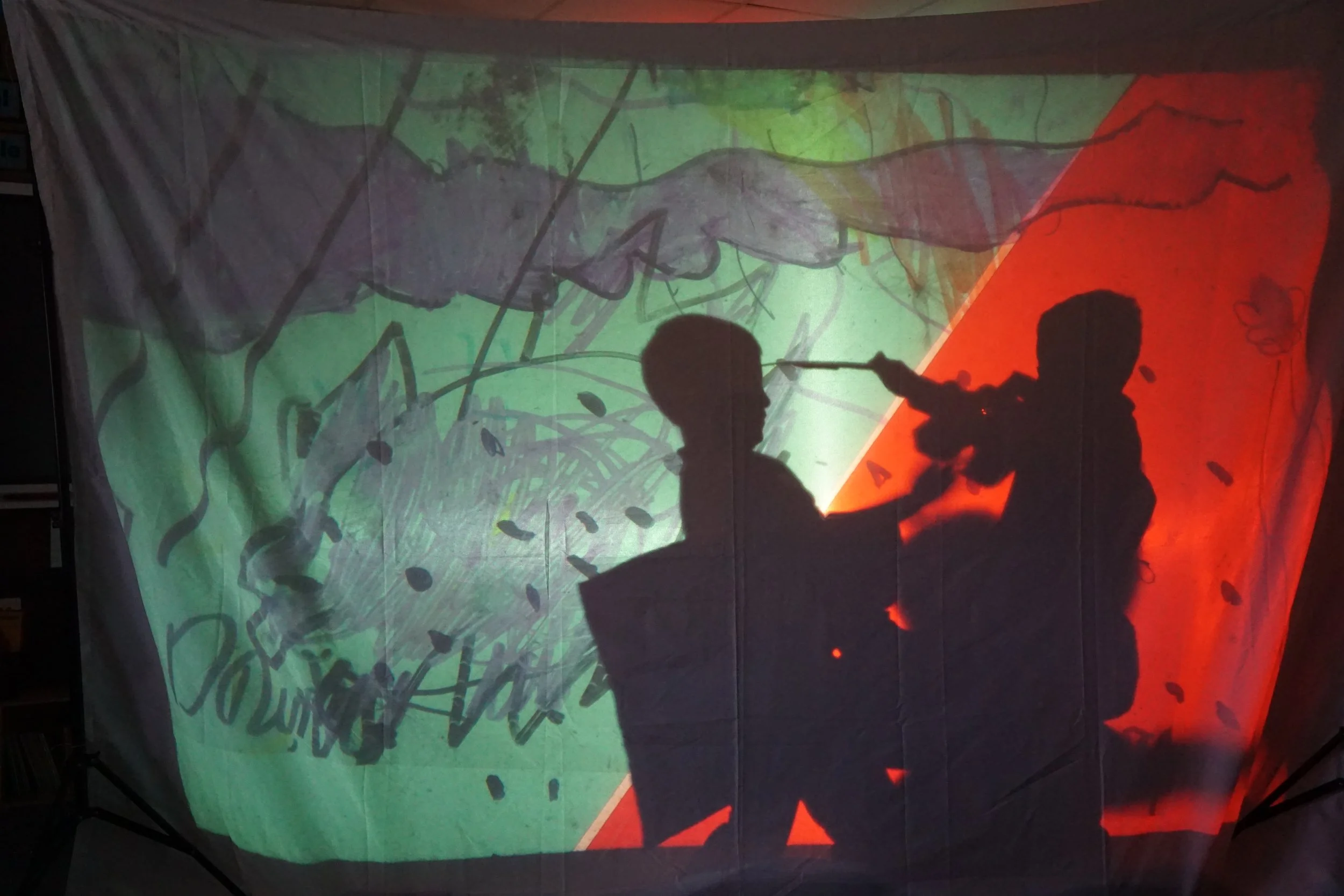 At South Lake Primary School, Matt and Holly began the sessions with an exploration into “What is the Forest of Imagination,” letting the children lead the way. Inspired by Matt’s “insect vision” structures in the Forest Sketchbook, the children wanted to explore how we view the world around us through our eyes. We used UV pens and a UV camera to create invisible drawings, and made vision goggles which encouraged them to imagine a mythical creature’s world. We went on various meditation journeys to imagine how the rest of it might look, act, feel, and where it might live. The children were keen to become these things, which led us to making costumes, sets and props for a colour-filled shadow puppet show behind a white sheet screen. We encouraged them to use the OHP as a place to consider their setting; colours, shapes, and atmosphere, and used it as a backlight to frame the scenes. They instructed Matt behind the curtain, and drew their own textured sets on acetate, sometimes with cut out shapes layered on top, with requests for “rain” and “bobbing sea”. We ended up with a series of “freeze frames” and thoughtful self-led choreographed 30 second stories, totally written and performed by the children.
