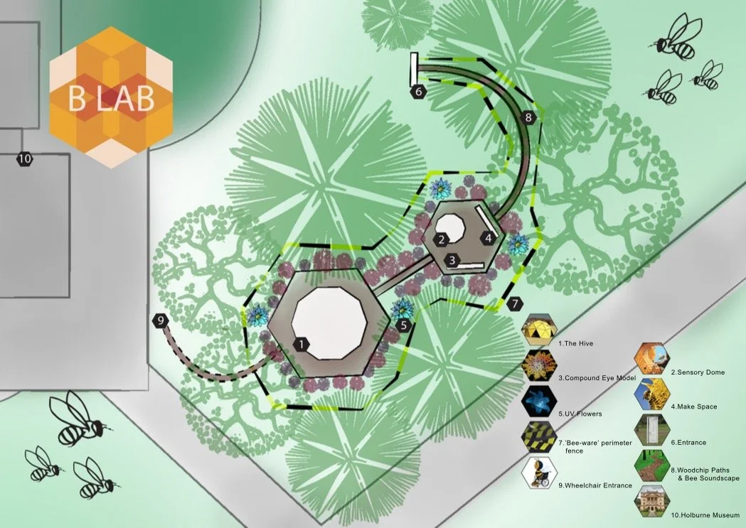 Inspired by the childhood idea of a hidden laboratory, BLAB (Bee Lab) was concealed within the museum gardens, inviting visitors to pass through a secret entrance and step into the world of bees. The installation explored the extraordinary lives of bees and their vital role within wider ecosystems, offering a glimpse into how they perceive and interact with the world around them.