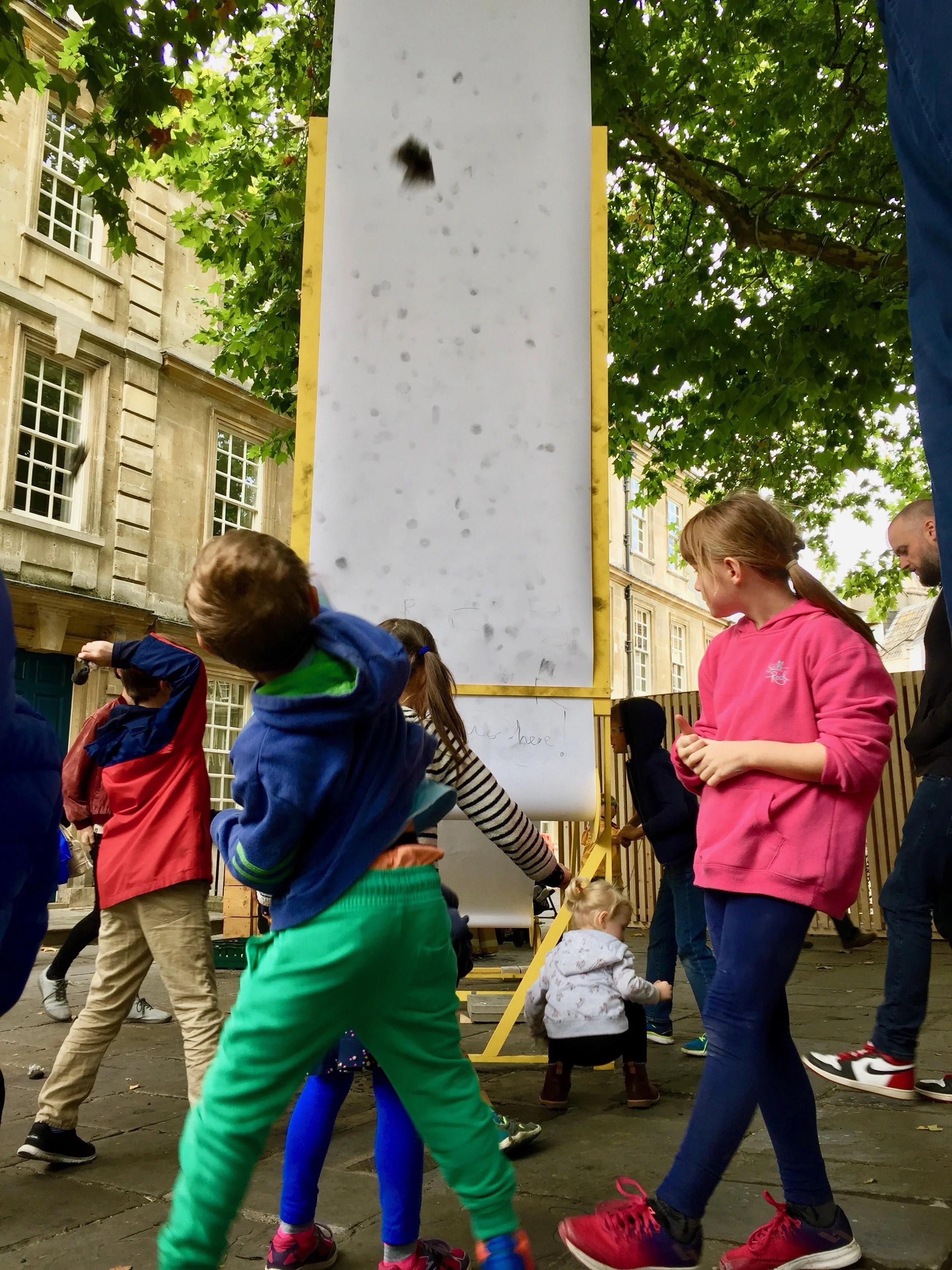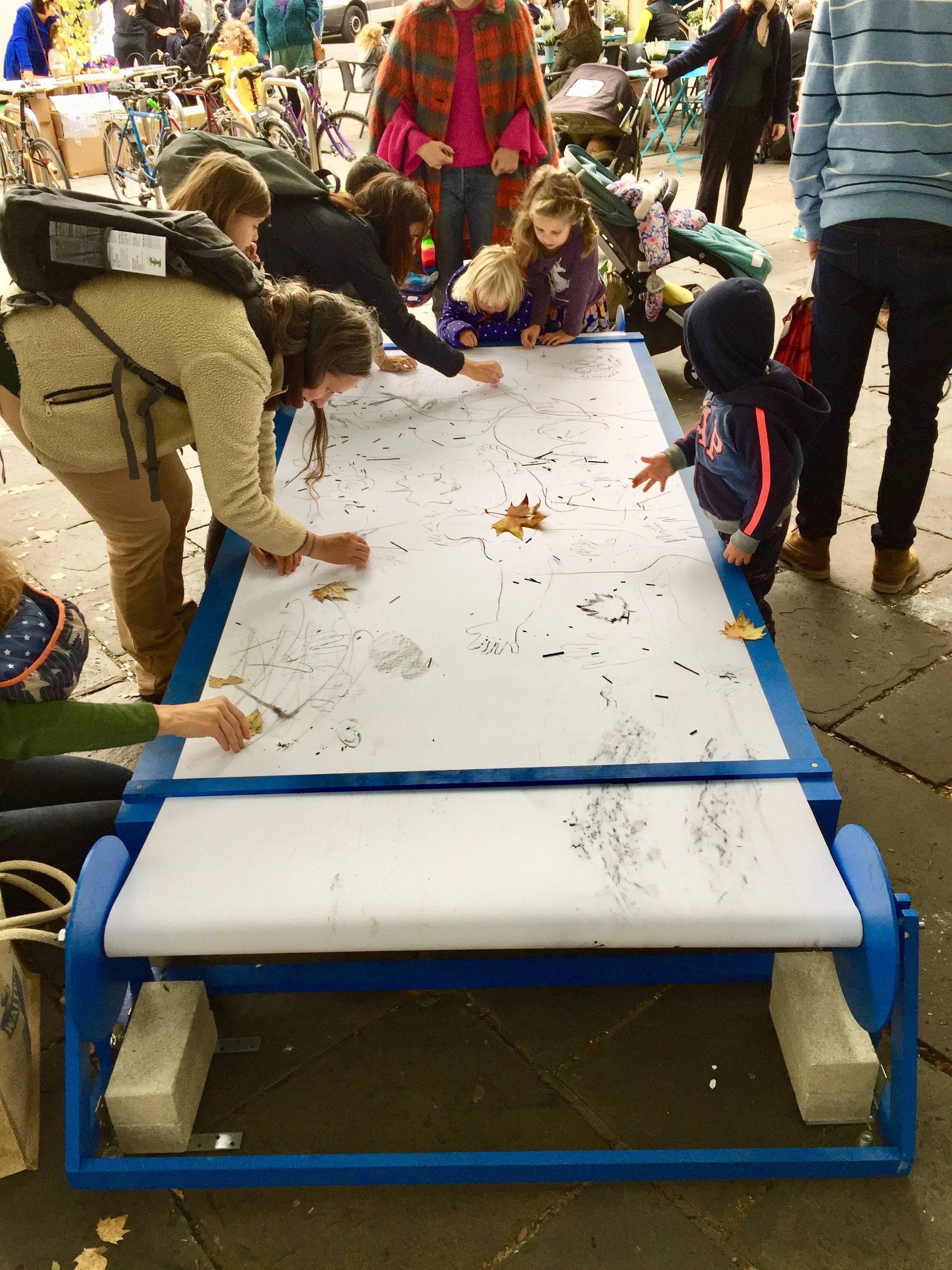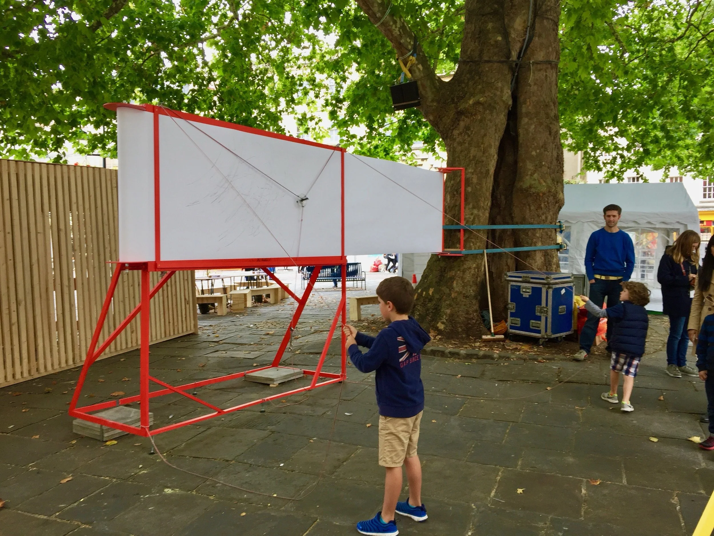 The Drawing Machines is a participatory artwork created for Forest of Imagination 2018, installed in Kingsmead Squareas part of a wider programme across the city. The work consisted of three large-scale drawing machines, each representing a different forest habitat: the forest floor, the understory and the canopy. Arranged at varying heights and orientations, the machines translated ecological ideas into physical acts of mark-making. The forest floor machine sat low to the ground, inviting tiny, creeping marks that echoed the movement of small ground-dwelling creatures. The understory unfolded horizontally in front of the body, producing sweeping, pendulum-like gestures inspired by animals swinging between branches. The canopy rose vertically, encouraging participants to throw muslin sacks filled with charcoal dust upwards, creating splattered marks that referenced frogs leaping from leaf to leaf high in the trees. Each machine used charcoal in different forms—from small fragments to chunky blocks and powdered dust—allowing for a wide range of textures and scales. Visually, the machines drew on Piet Mondrian’s abstracted studies of trees, constructed from primary-coloured timber elements arranged like branching, geometric forms. By mediating how bodies could interact with the paper, the machines removed the intimidation of the blank page while enabling bold, expansive marks to be made in a public square. Children instinctively jumped in and played, while adults engaged with deeper references to abstraction, ecology and perception. Designed to be intuitive and inclusive, the work also opened up large-scale drawing to people with limited mobility, allowing small movements to generate marks far beyond the reach of the body.